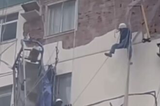 O andaime de um prédio em obras tombou e trabalhadores ficaram pendurados…