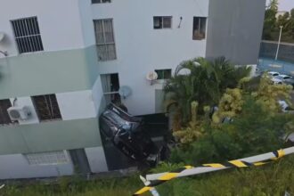 Carro cai de ribanceira, capota e entra em condomínio em Salvador; veja imagem impressionante