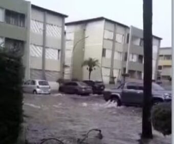 Água invade condomínio e deixa estacionamento submerso durante temporal em Ribeirão Preto; VÍDEO